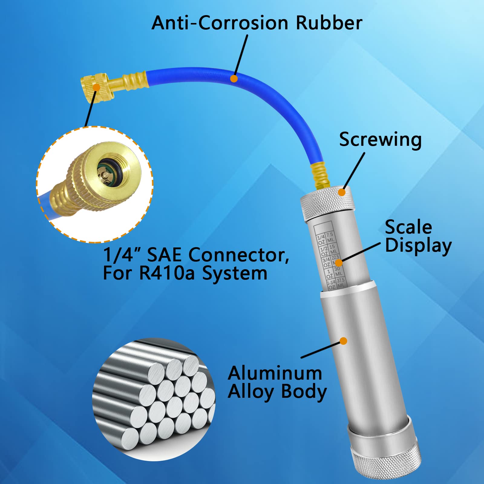 - 【How To Use】Oil cylinder of refrigerant oil injector is filled with 2 ounces of refrigeration oil, check valve screwed onto cartridge and tightened. The inner and outer cylinders are tightened clockwise, and then a little 1/4 SAE threaded inner core is used to discharge a little air inside the blue tube. Connect the low-pressure port of the refrigeration system that needs to be refueled, and add the required amount of cooling oil to the inner and outer cylinders.