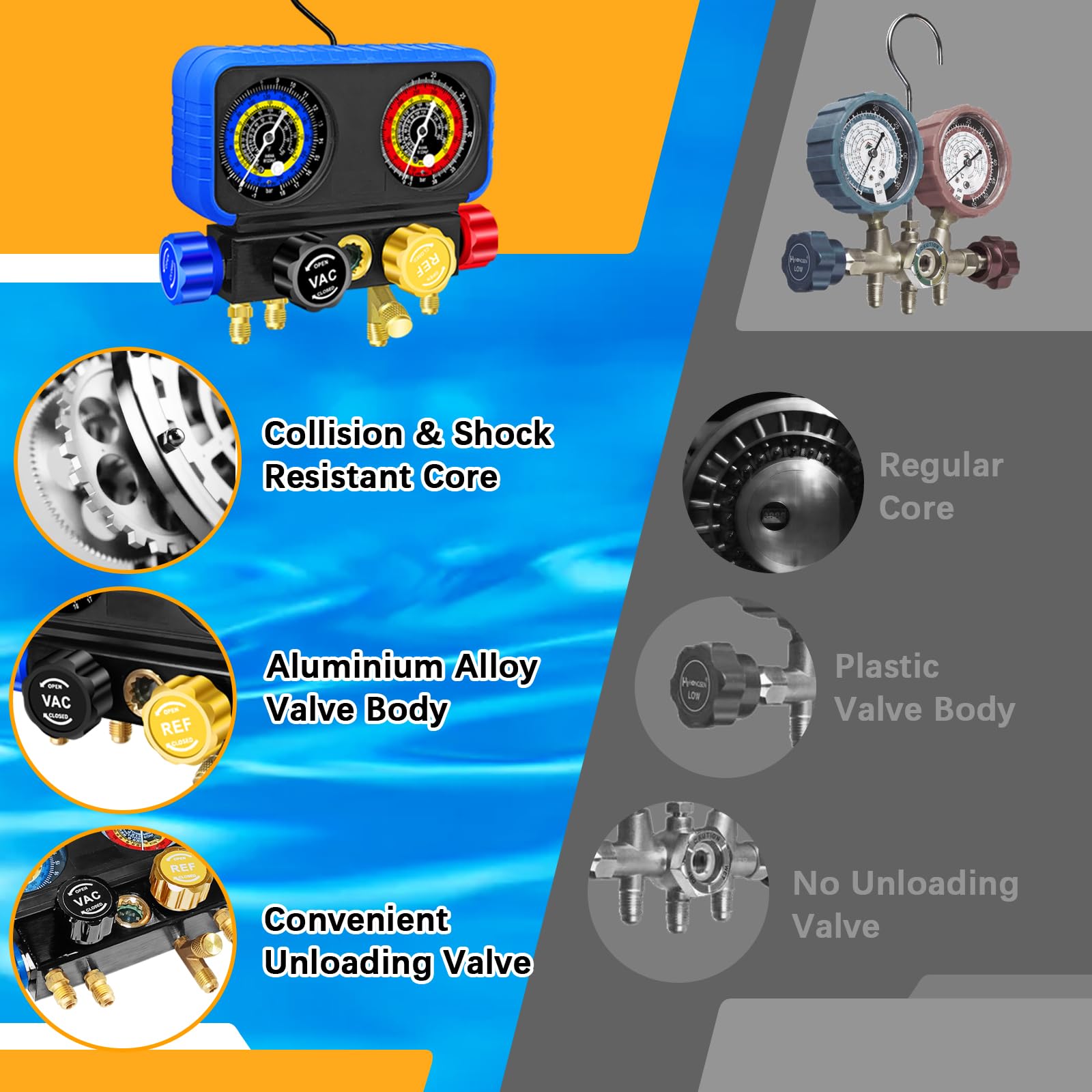 - 【AC Gauge】 The gauge in the AC gauge set is an essential component for measuring and displaying the pressure levels in the air conditioning system. features colored dials and ℉ unit which is easy to read, sight window on the manifold helps to see the flowing liquid refrigerant.