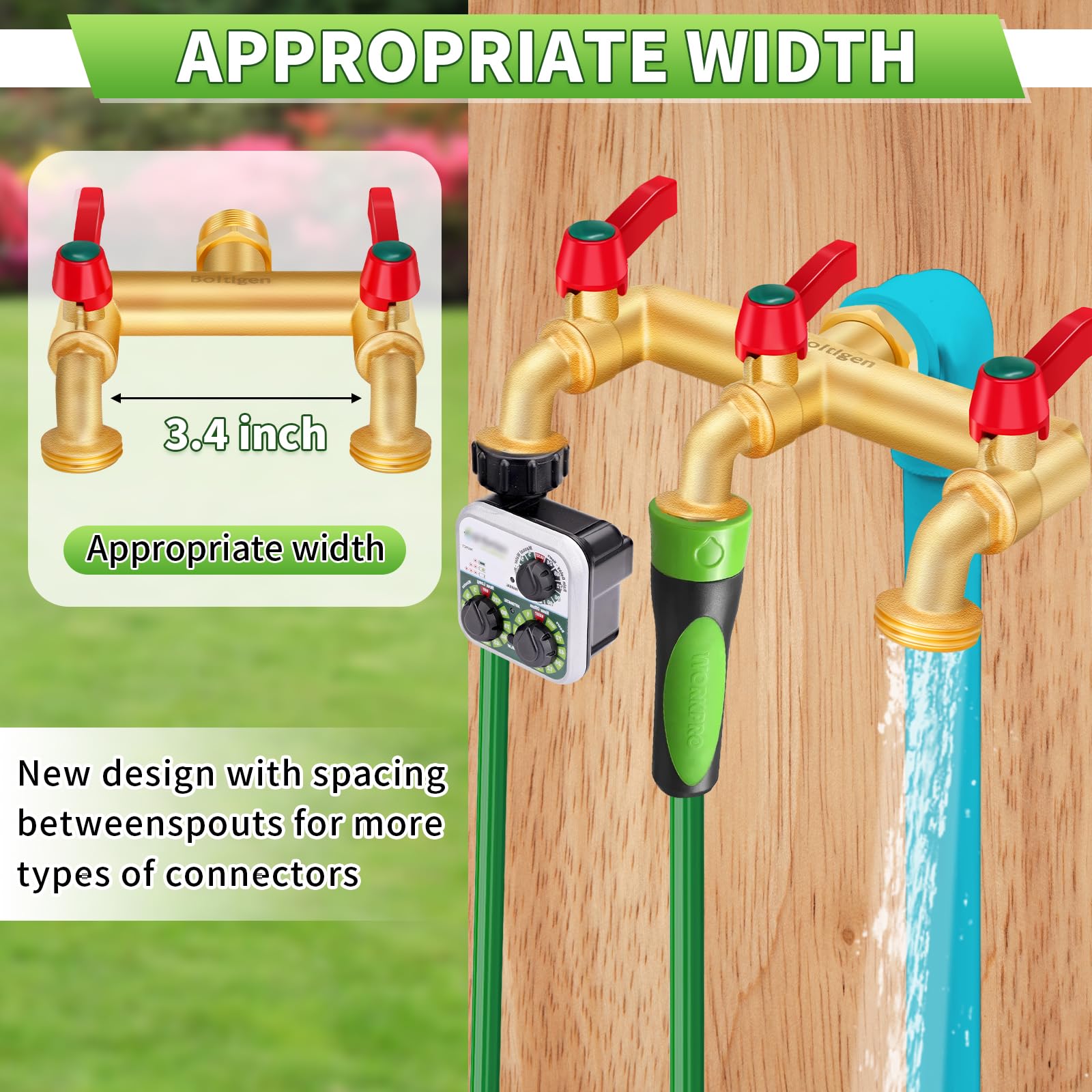 - 【Enhanced Design】 Our 3 way garden hose splitter has wide distance between spouts, allowing you to easily attach and use multiple hoses, lawn sprinklers or watering timer simultaneously, without any interference.