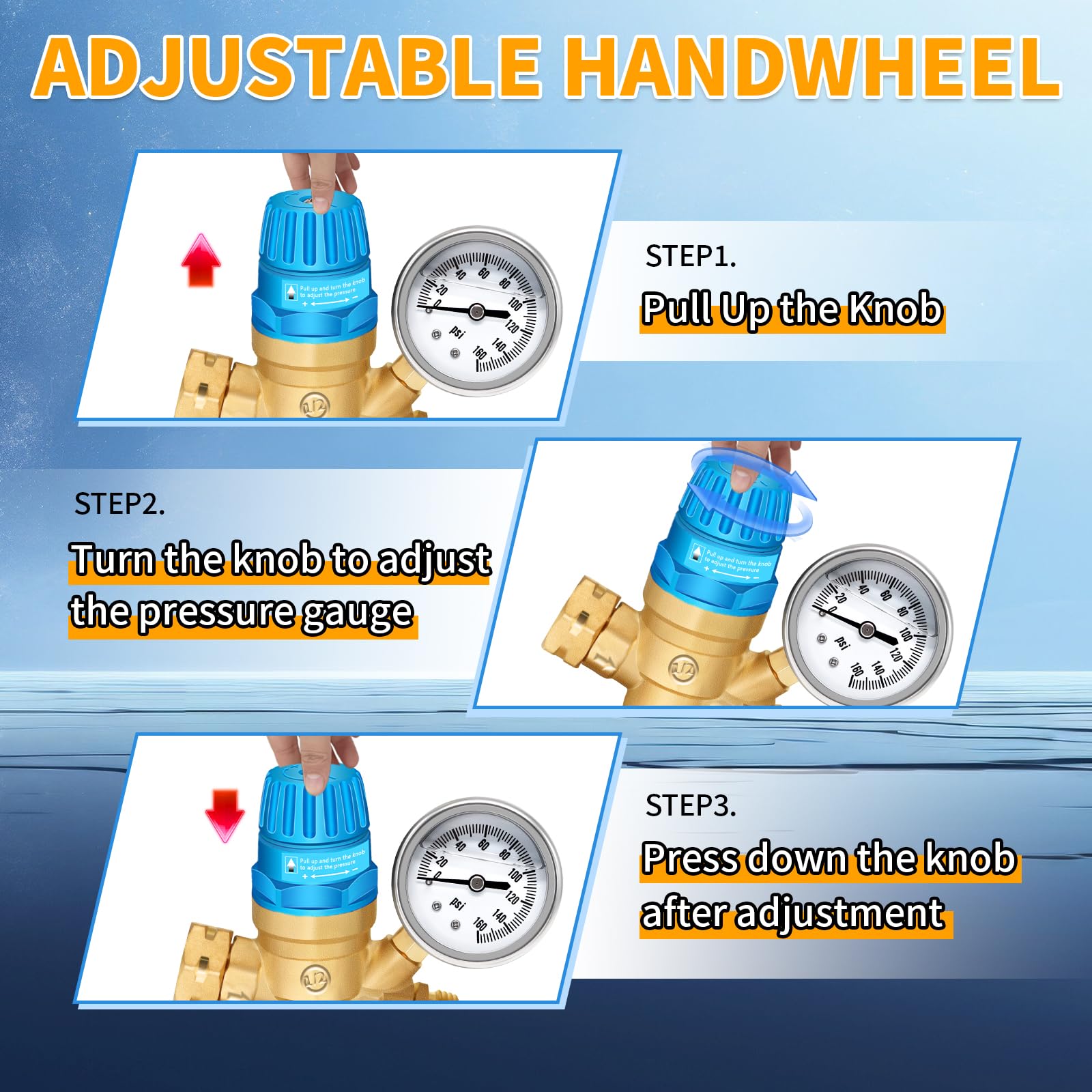 - 【HANDWHEEL ADJUSTABLE】Our new design of water pressure regulators with adjustable handle, just use your hand to clockwise or counterclockwise the top to adjust the pressure, no tool needs, easy to operation. Upgrade the blue handle for easier identification and observa