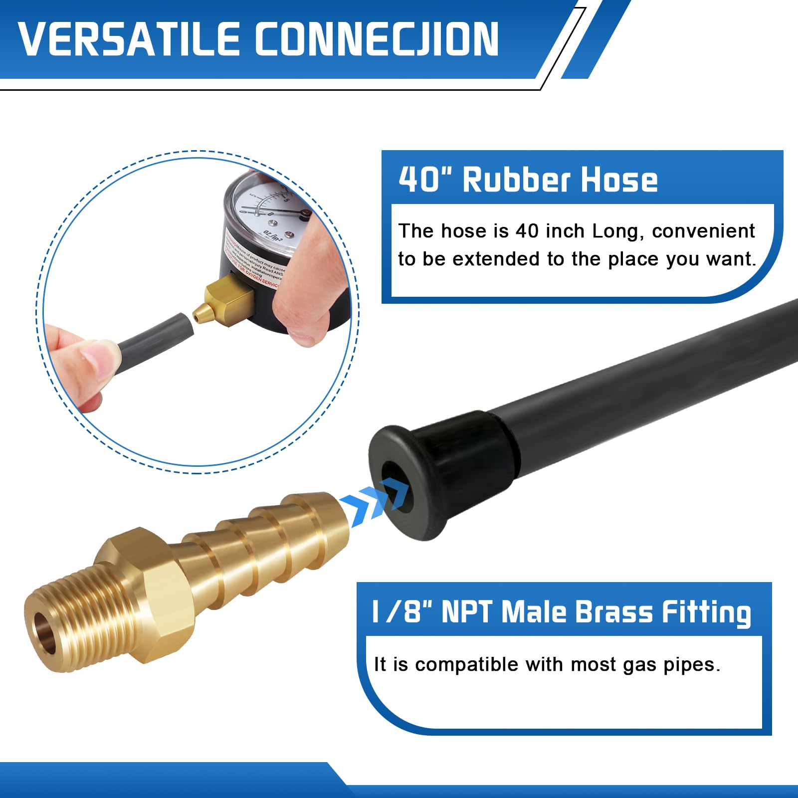 - 【Extended Pressure Hose】 LP gas pressure tester is equipped with a 40-inch pressure rubber hose, the kit offers ample reach and flexibility for accessing and testing gas pressure at different points within the system for optimal safety and performance.