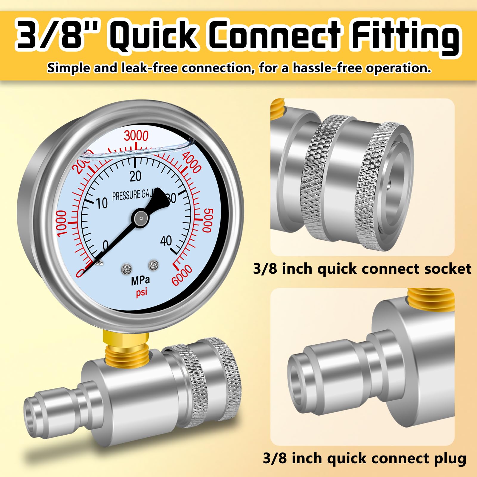 Boltigen Pressure Washer Gauge Kit, Pressure Gauge for Power Washer with 3/8inch Quick Connect, Stainless Steel, 6000PSI