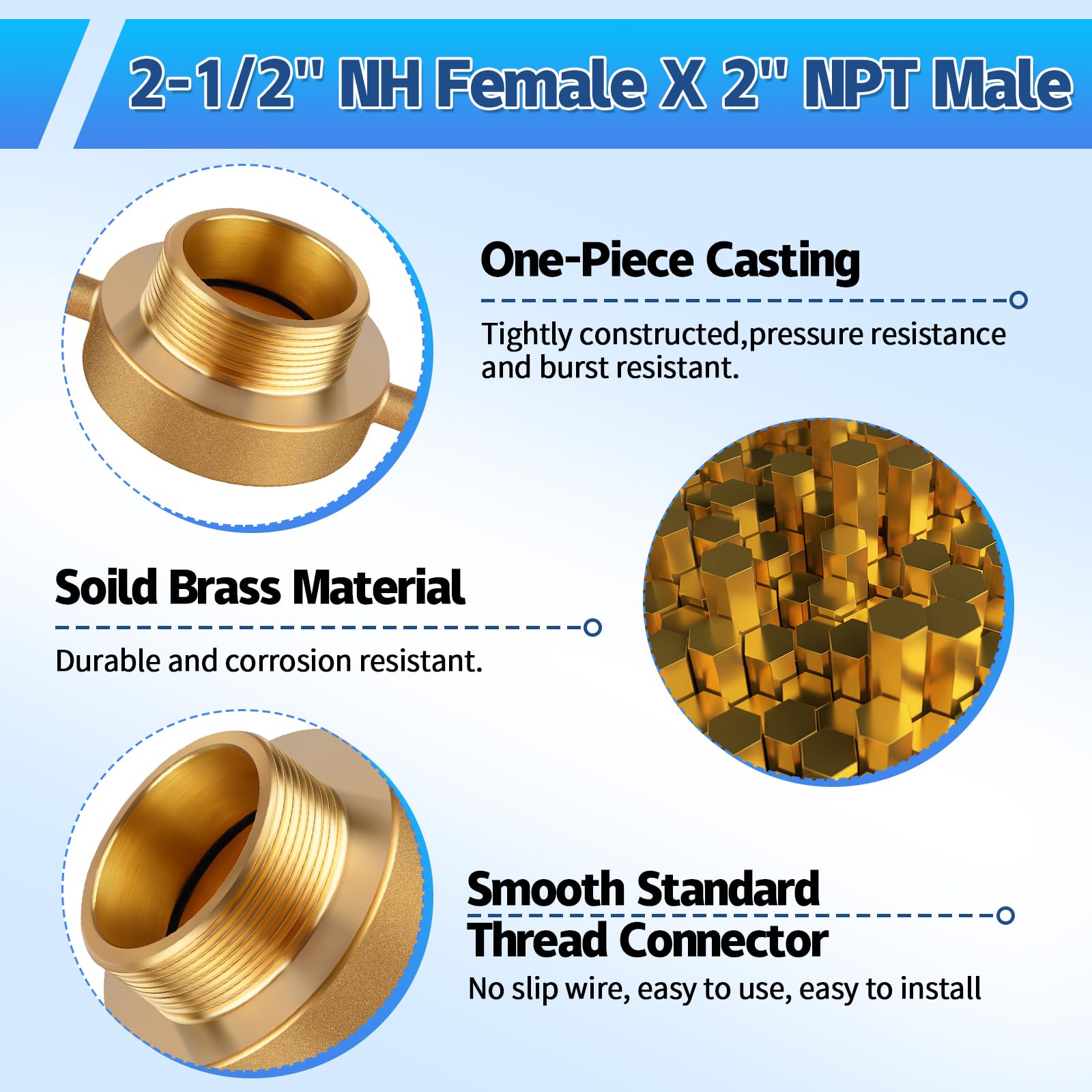 - 【Size】Brass fire hydrant adapters with 2-1/2" National Standard Thread (NST) female on one end for connecting to the hydrant and a 2’’ NPT male on the other end for connecting to a hose. Perfect for attaching to fire hydrant.